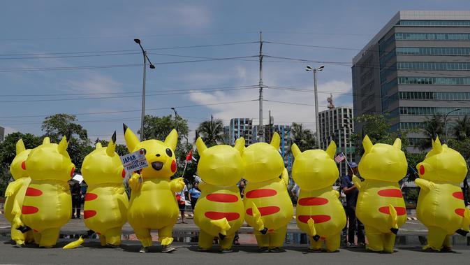 Aktivis lingkungan mengenakan kostum Pikachu berjalan menuju kedutaan besar Jepang di Manila, Filipina, Selasa (25/6/2019). Para aktivis memprotes Jepang untuk menghentikan pembiayaan batu bara saat mereka bersiap untuk menjadi tuan rumah KTT G20. (AF Photo/Aaron Favila)