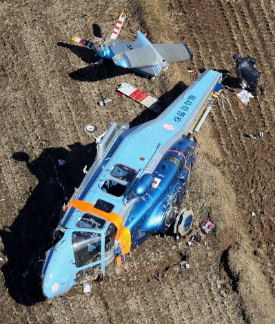 不時着したのは県警航空隊の中型ヘリ「あづま」。県警地域企画課の村上祐司課長(59)や医師、井戸田佳史さん(39)ら4人が胸の骨を折るなど重傷、3人が軽傷を負った。機体は後部が破断するなど大きく損傷した。