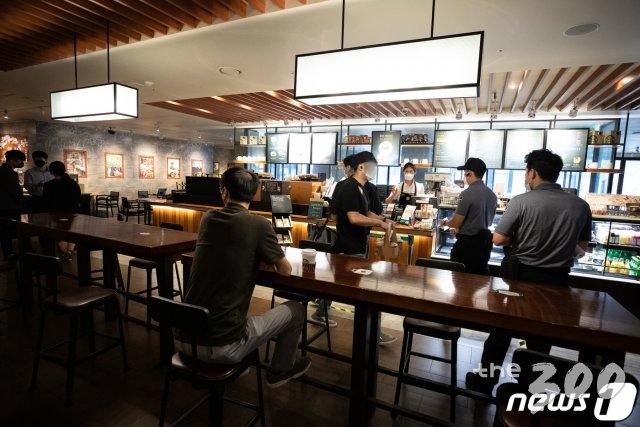 | (서울=뉴스1) 유승관 기자 = 수도권 사회적 거리두기가 2단계로 완화된 14일 서울시내 한 프랜차이즈 커피전문점에서 시민들이 매장을 이용하고 있다. 정부는 신종 코로나바이러스 감염증(코로나19) 예방을 위한 수도권 사회적 거리두기를 9월27일까지 2단계로 완화하고, 28일부터 추석과 개천절 연휴간 코로나19 확산 위험을 고려해 10월11일까지 특별방역기간으로 설정하기로 했다. 2020.9.14/뉴스1 |