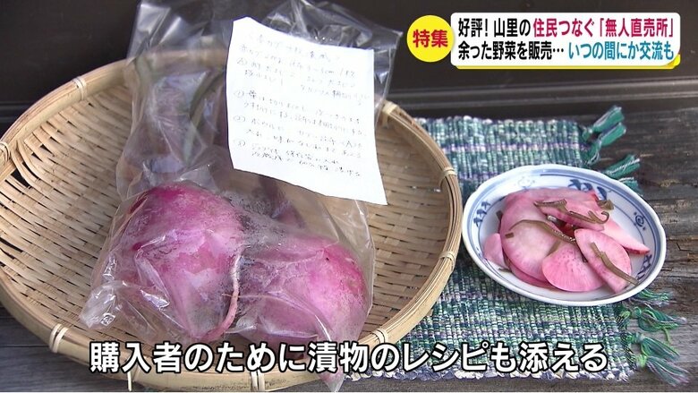 購入者のために、佐鹿さんは赤カブに貼った紙に漬け物のレシピも添えた。